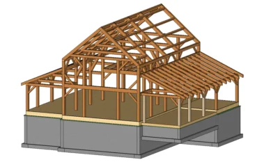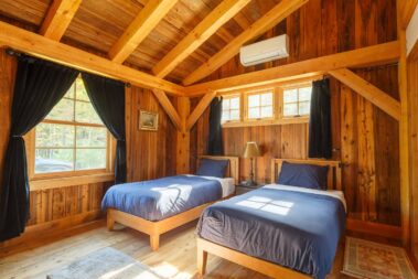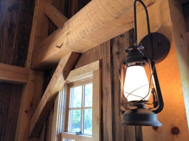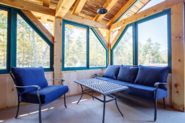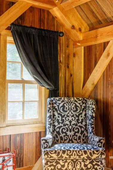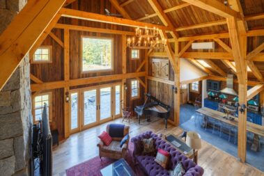 This project was designed with openness in mind. Two equal wings give the ground floor additional space, while the vaulted great room, with its view of the landscape, invites indoors the airy freedom of the mountains. The use of sling braces take away the need for posts in the great room, allowing for a spaciousness that is evident throughout the home.